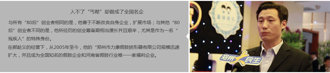 鄭州市力康假肢矯形器有限公司(簡稱力康),是一家專業從事假肢矯形器的設計、研發、制作及裝 配的專業機構。成立于1992年是河南省唯一一家福利企業。力康下設業務部、技術部、住院部、康復 部、售后服務部,并配有現代化的裝配車間和功能齊全的訓練大廳,為殘疾朋友康復訓練提供了可靠 保障??偨浝泶┐骷僦嗄?,有著豐富的臨床經驗和親身體會;多年來,力康已為全國幾十萬名殘疾 朋友安裝上舒適、美觀、耐用的假肢和矯形器具,使他們更大限度地恢復了正常的工作和生活。“產 品即人品”的質量理念、先進的技術、實惠的價格、完善的售后服務是力康取勝的法寶……